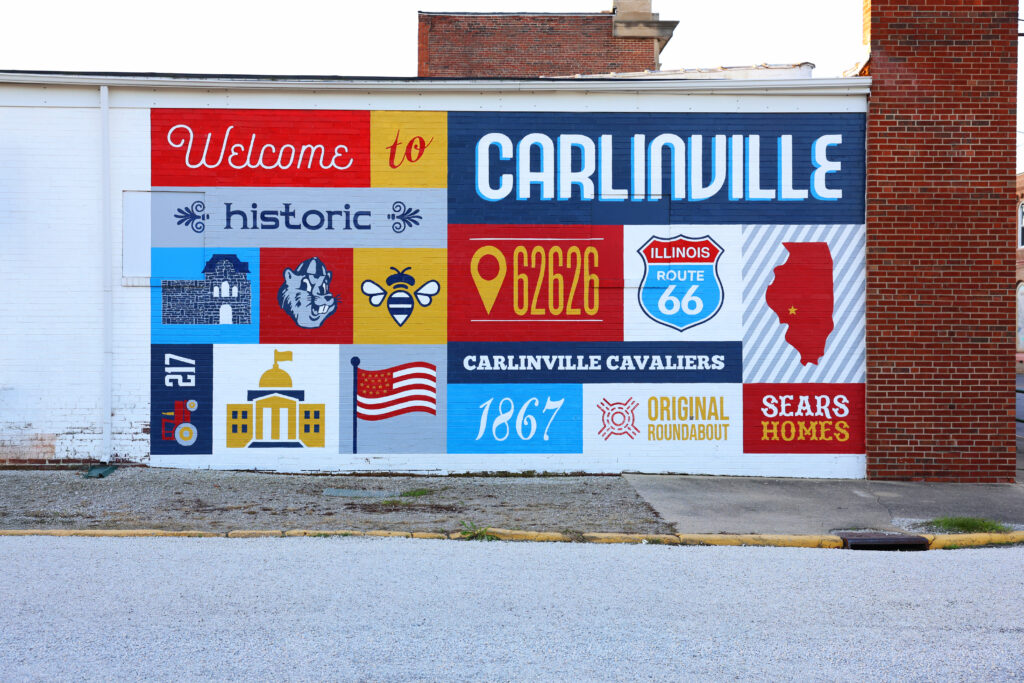 The Carlinville mural was inspired by vintage postcards highlighting the town’s attractions. The mural was painted by Carlinville citizens Bernie Gietl and D.L. Whitlock-Gietl and incorporates components of the Carlinville…