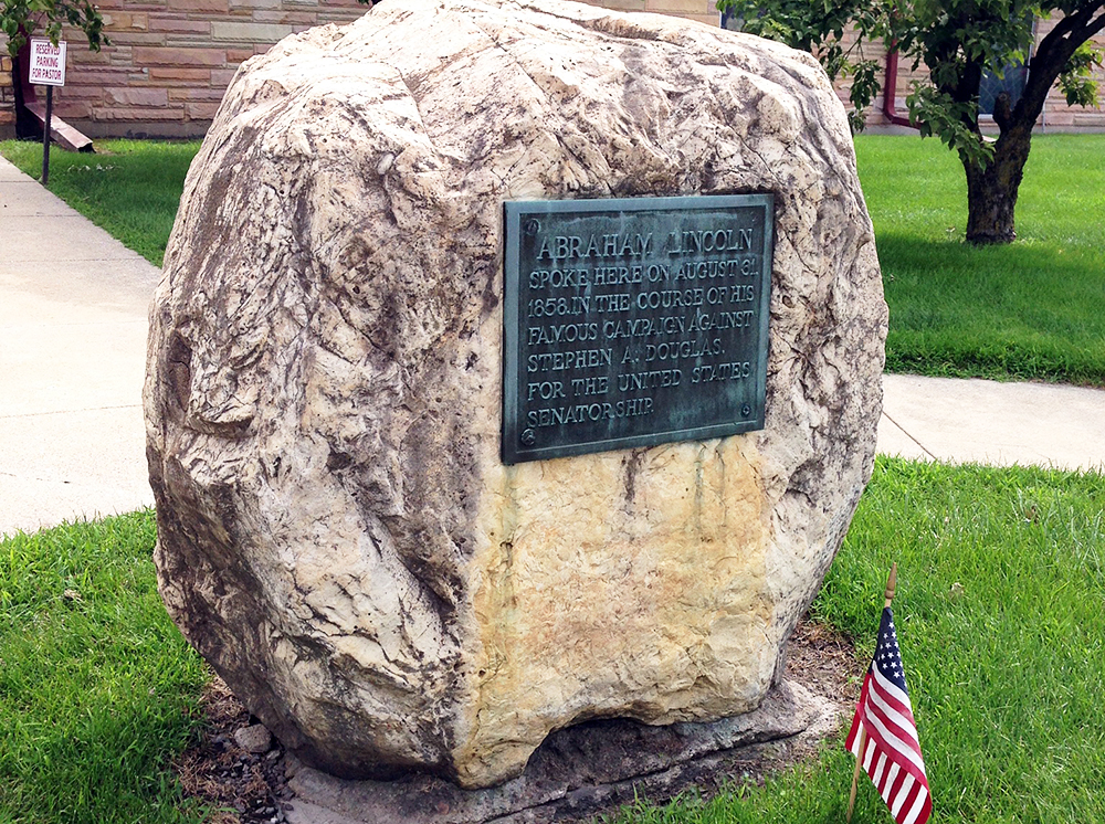 This large stone commemorates the site where Abraham Lincoln delivered a speech on August 31, 1858, while campaigning for U.S. Senate against Stephen A. Douglas. He lost that election but…