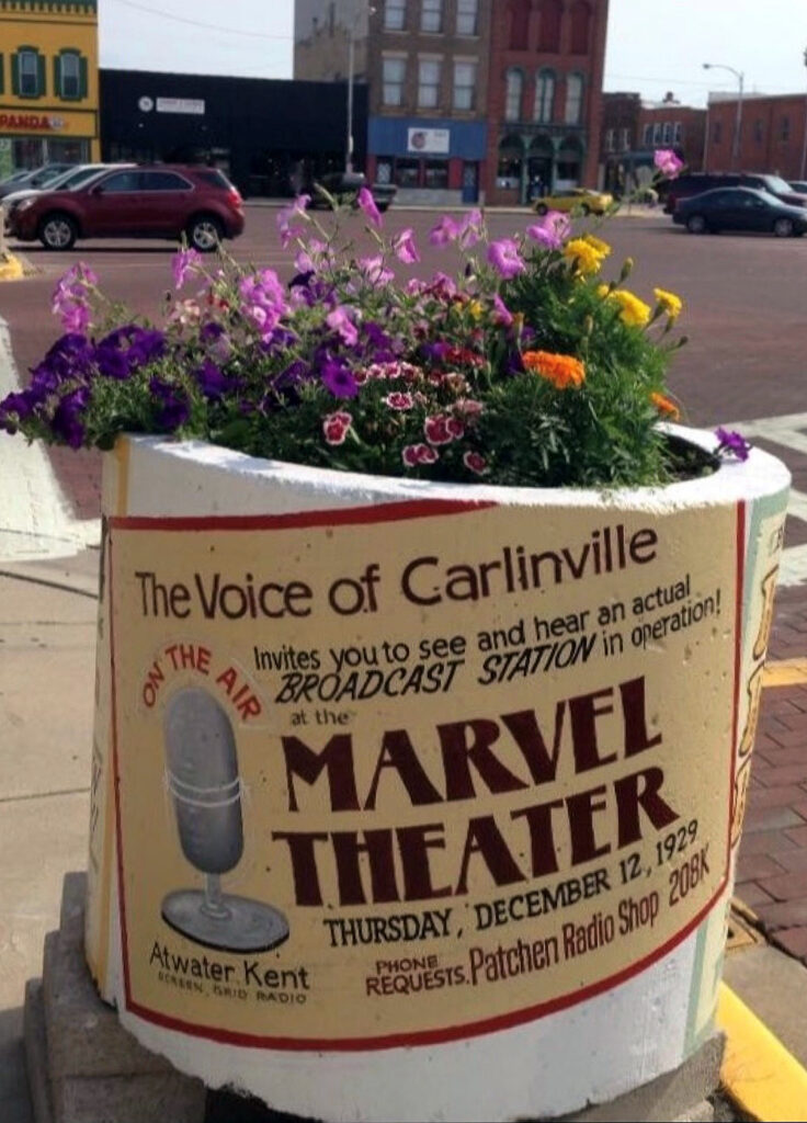 The cement planters around the Square are being painted by Carlinville’s Walldog artists, Bernie Gietl and D.L. Whitlock-Gietl. The subject matter is authentic advertisements printed in the Carlinville newspaper from…